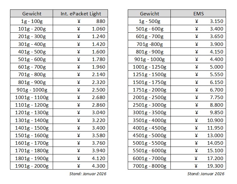 Hier findest Du eine Auflistung der Versandskosten nach Gewicht und Versandart. Erklärungen zum Versand von Japan nach Deutschland findest Du hier auf unserer Seite.